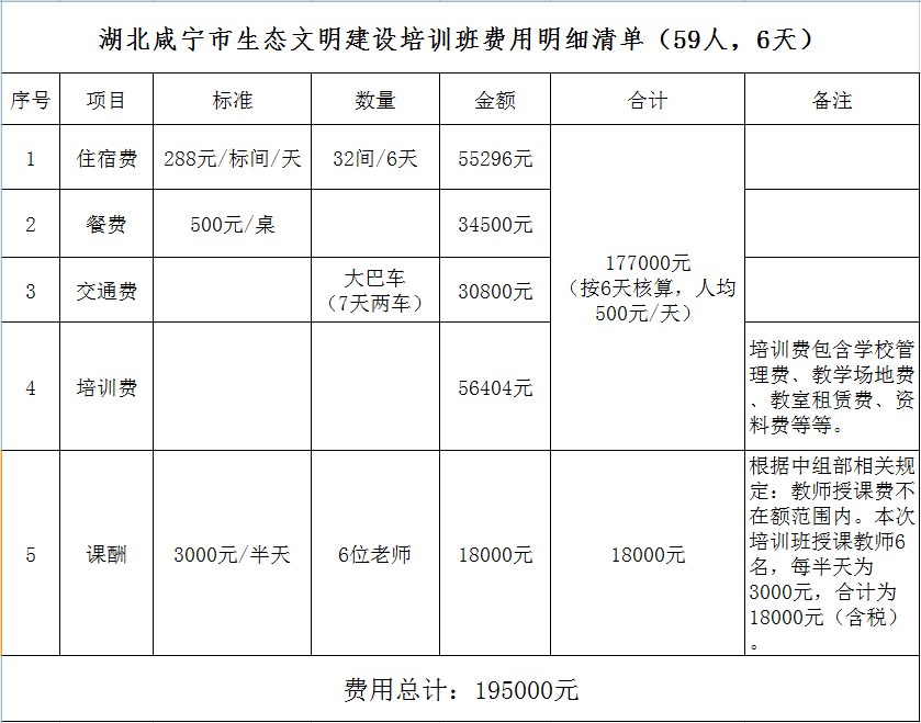 名 称: 湖北咸宁市生态文明建设培训班费用明细清单 发布日期: 2019年09月02日