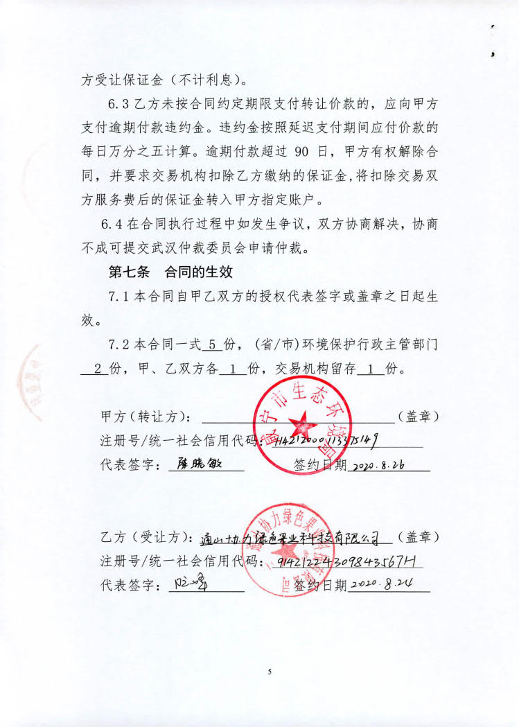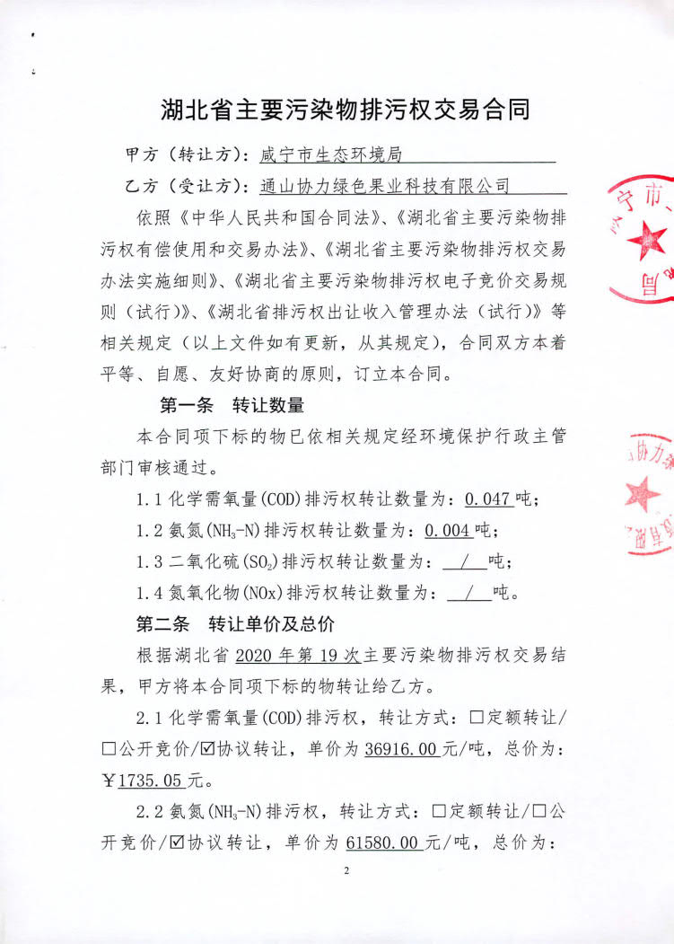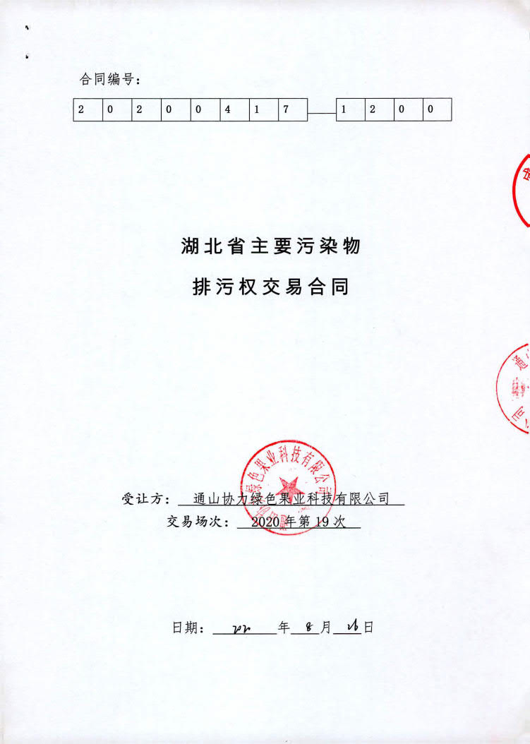 名 称: 通山协力绿色果业科技有限公司排污权交易合同 发布日期: 2020年09月01日