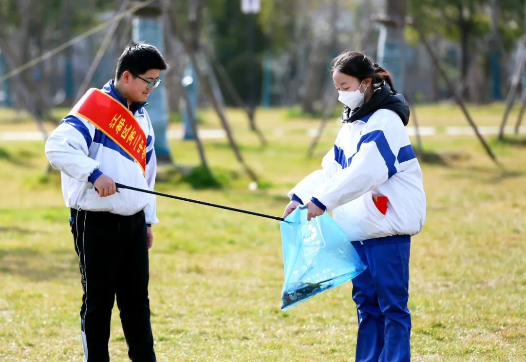 2022年3月5日,在江苏省扬州市江都区双拥公园,江都区第二中学学生在学雷锋主题活动中捡拾垃圾。新华社发(任飞 摄)