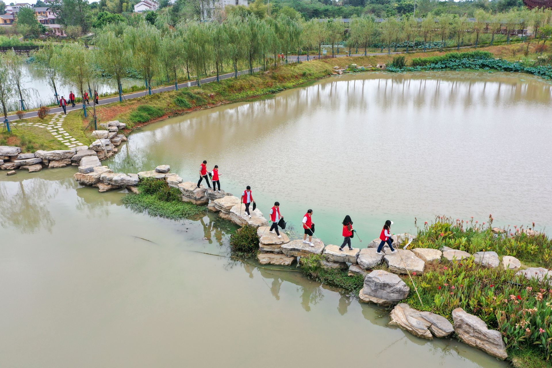 随后,志愿者们拿起工具,沿着湿地公园的湖堤,捡拾垃圾、清除杂草,把原本就环境宜人的湿地公园妆点得更加干净整洁。