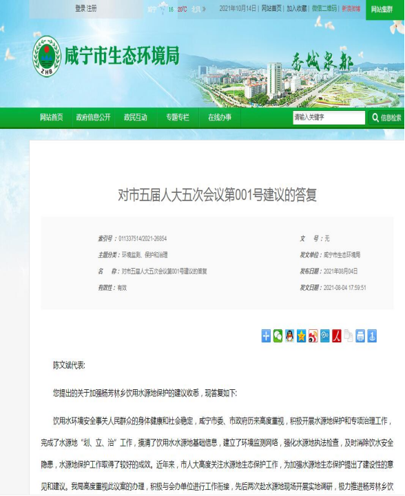 名 称: 咸宁市生态环境局2021年人大代表 建议和政协提案办理情况报告 发布日期: 2021年12月15日