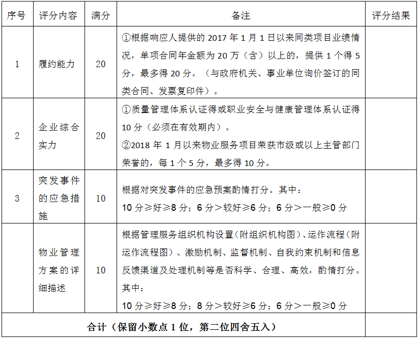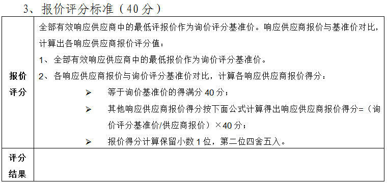 本次询价采取综合评分法(100分制),包括资质审查(否决性审查,不记分)、技术审查(60分),报价审查(40分)三部分。评审组先对响应供应商方资质文件评审,然后对资质文件符合询价公告要求的响应供应商进入报价文件评审。评审工作结束后,两部分合计得分由高到低确定一名供应商(得分最高者),其他有效供应商按合计得分由高到低依次为备选询价供应商。评分结果当面告知各供应商。评分细则如下:
