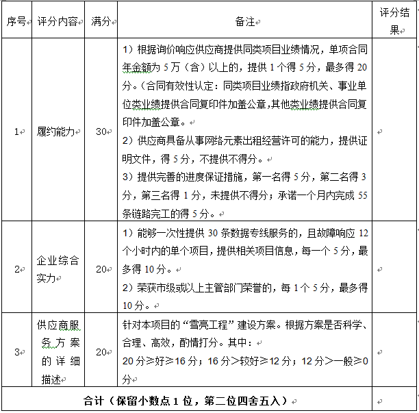 本次询价采取综合评分法(100分制),包括资质审查(否决性审查,不记分)、技术审查(70分),报价审查(30分)三部分。询价小组先对供应商响应资质文件评审,然后对资质文件符合询价文件要求的供应商进入报价文件评审。询价评审工作结束后,两部分合计得分由高到低确定一个供应商(得分最高者),其他有效供应商按合计得分由高到低依次为询价备选供应商。评分细则如下: