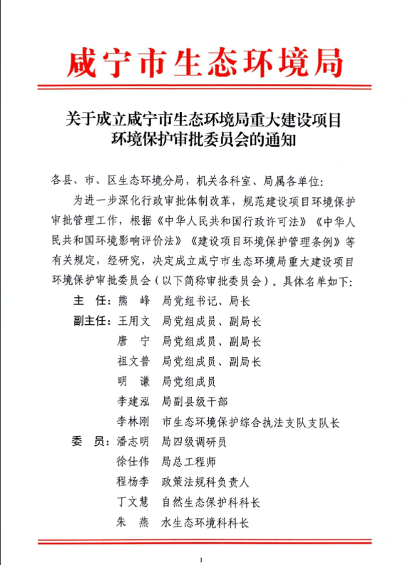 关于成立咸宁市生态环境局重大建设项目环境保护审批委员会的通知