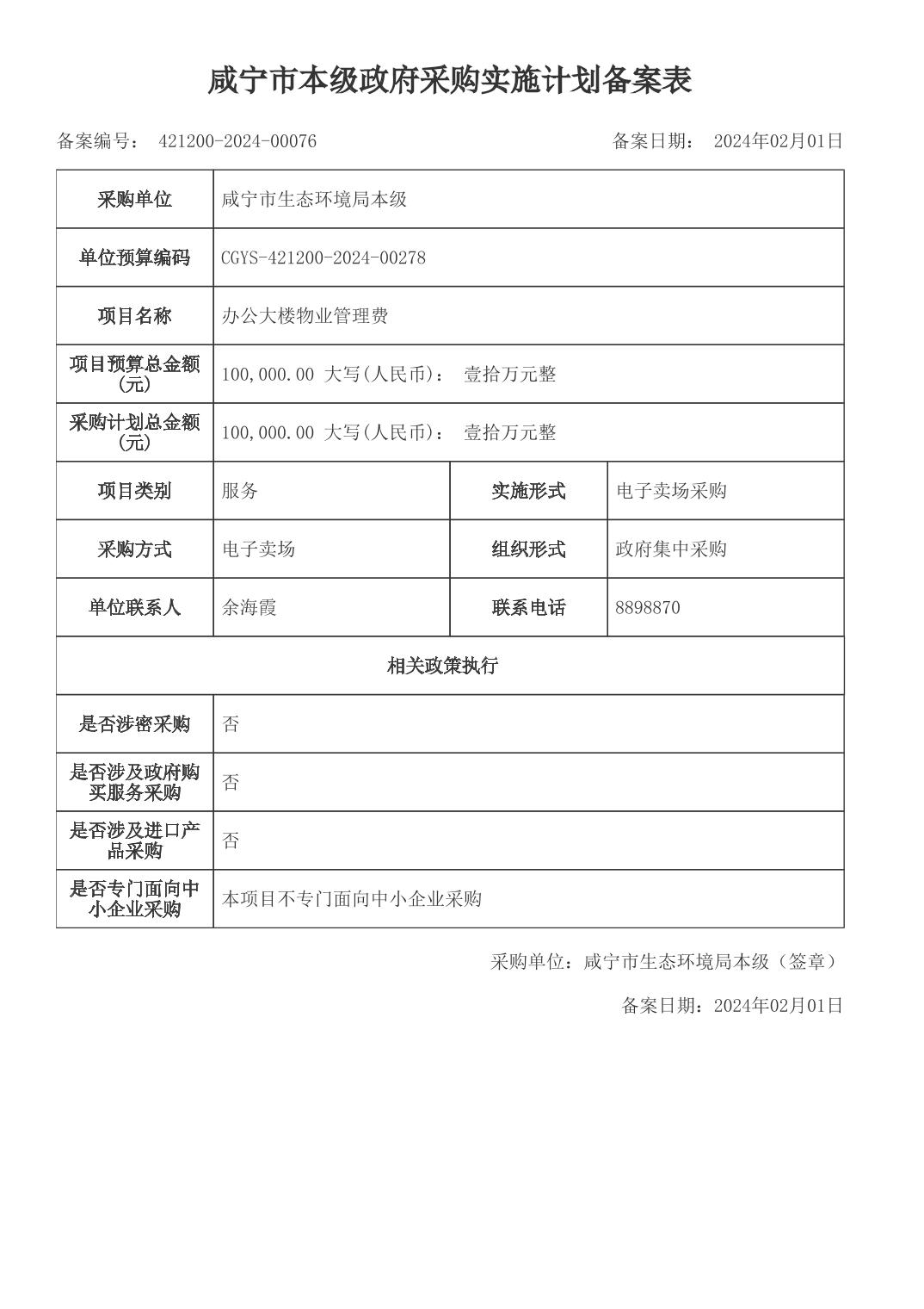 名 称: 咸宁市本级政府采购实施计划备案表 发布日期: 2024年03月21日