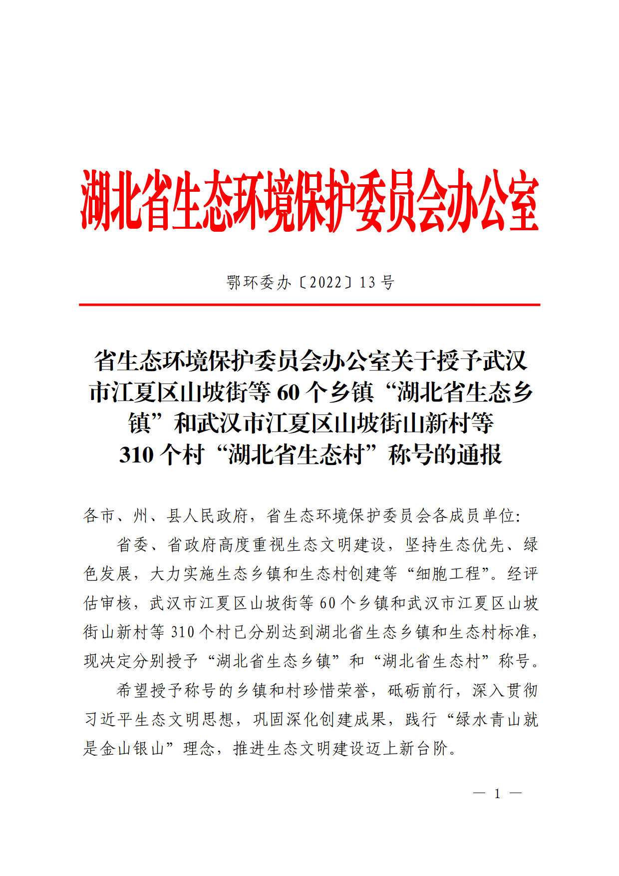 省生态环境保护委员会办公室关于授予武汉市江…村“湖北省生态村”称号的通报